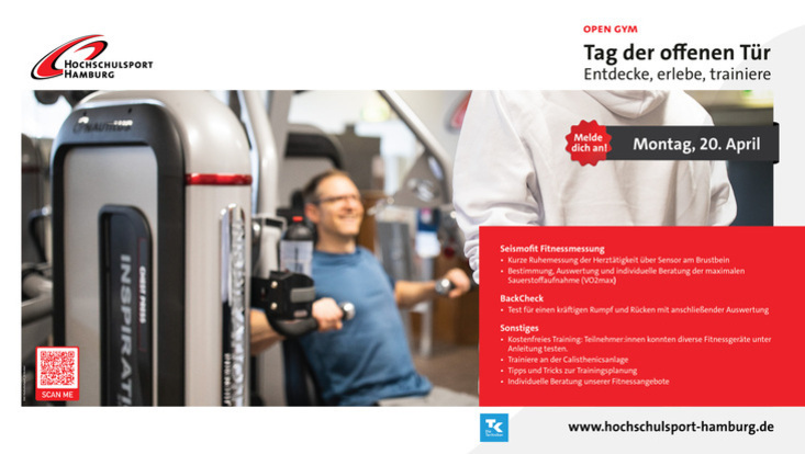 Am Montag, den 20. Aprilfindet im Uni-Studio der Tag der offenen Tür statt. Melde dich kostenfrei an, komm vorbei. Du kannst dich umfangreich informieren, Fitnessgeräte testen und an Aktionen in Zusammenarbeit mit der TK teilnehmen.